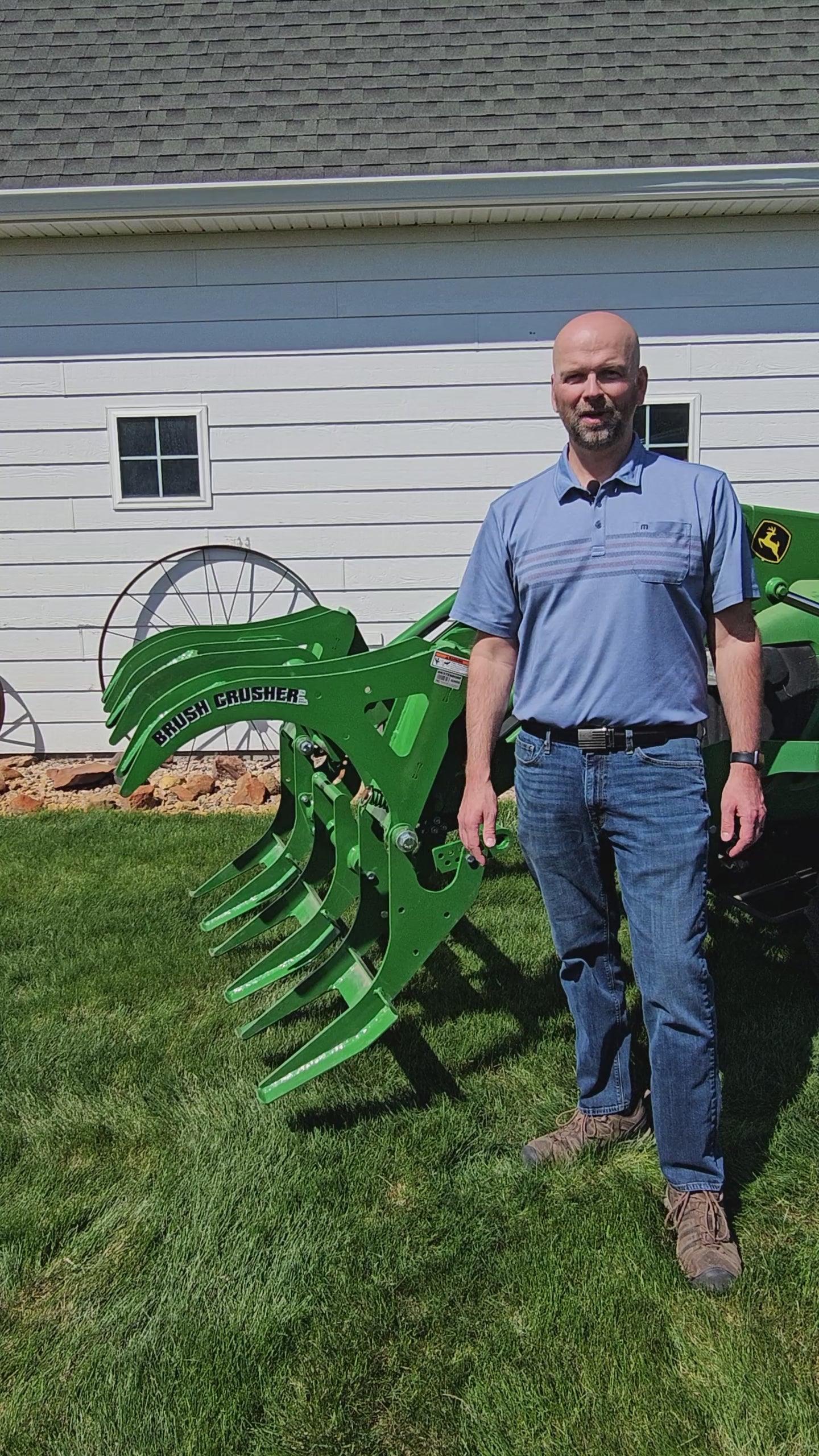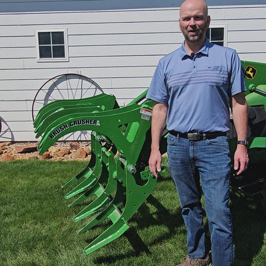 The new patent pending JD Brush Crusher attachment makes those painful labor intensive tasks like clearing trees, handling brush, or even cleaning up after a storm--fun! The new JD model is a mid-sized model of the Brush Crusher™ family, and it's adjustable so you can get the tooth action that you need. It is designed to fit on ANY loader with a JD style coupler.